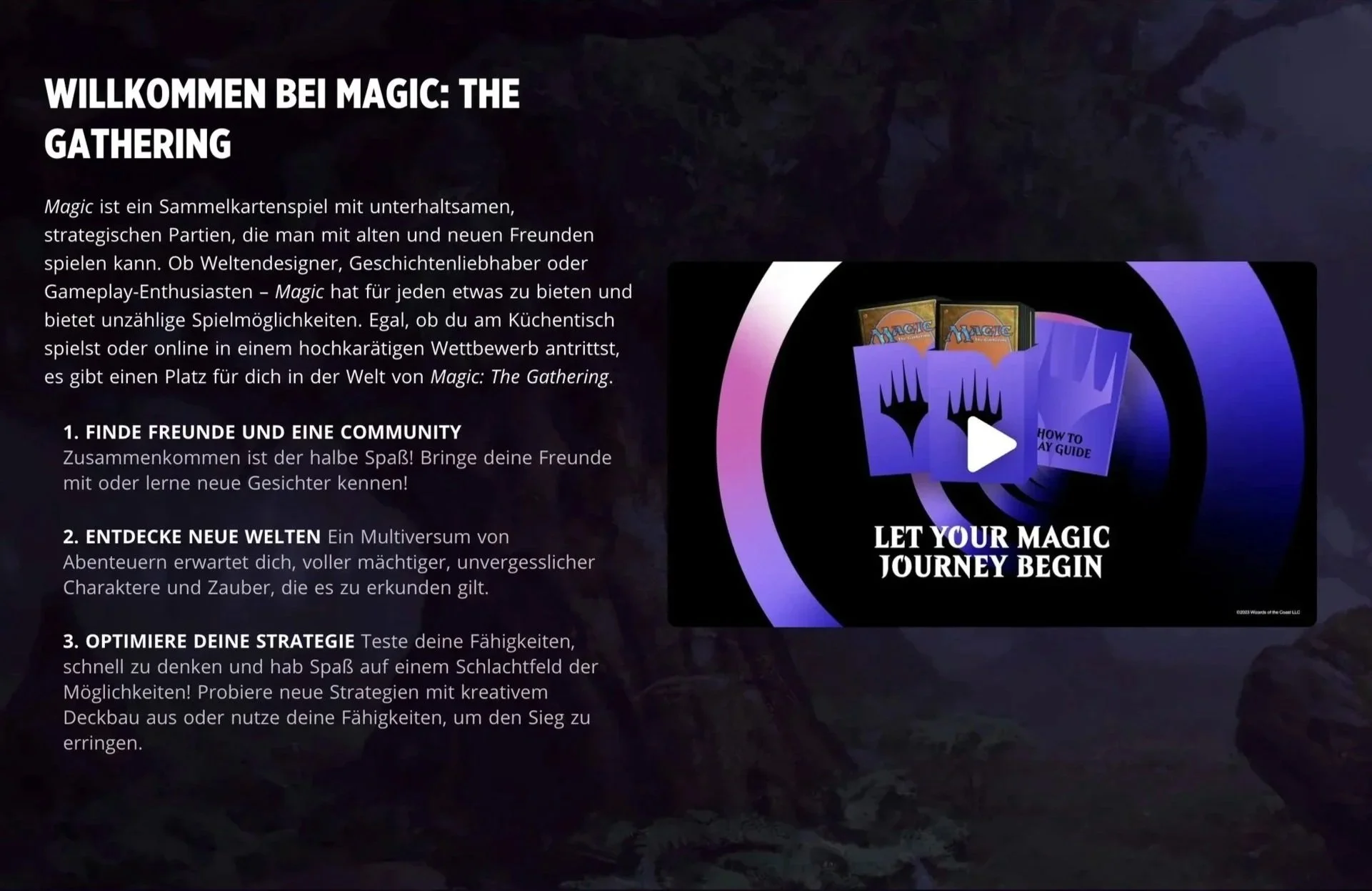 Dies ist der perfekte Startpunkt. Hier erfährst du, was es bedeutet, ein “Planeswalker" zu sein und was es mit Magic auf sich hat. Die Seite stellt dir kurz und knackig das Grundkonzept des Spiels, die Identität der fünf Mana-Farben und die epic Story dahinter vor, ohne dich mit zu vielen Regeln zu überfordern. Um zur offiziellen Einführung zu kommen, folge einfach diesem Link: https://magic.wizards.com/de/intro